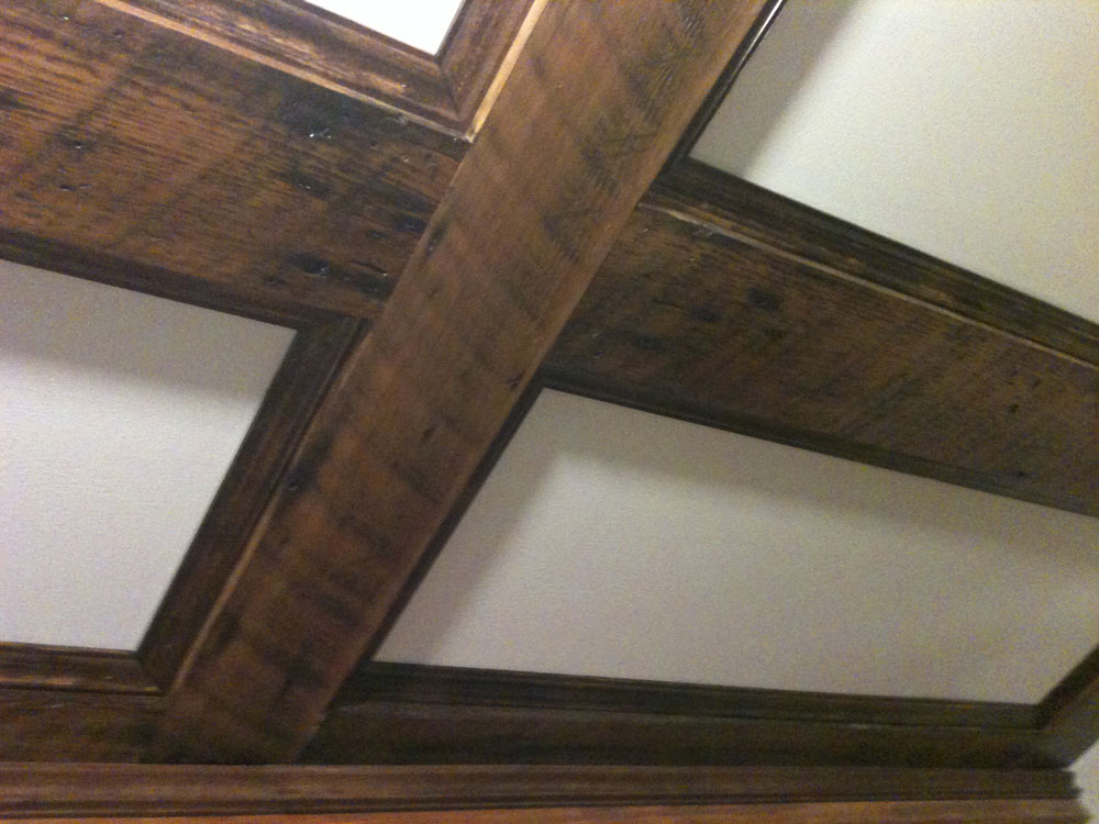 Reclaimed Kootenay Larch was used to create this tutor style ceiling