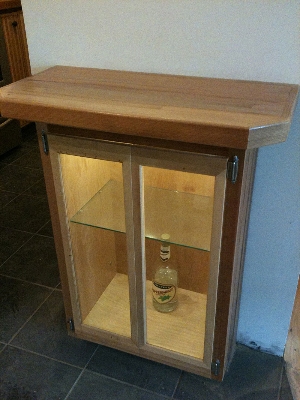 Upper liquor cabinet designed with top lighting and inset using reclaimed wood