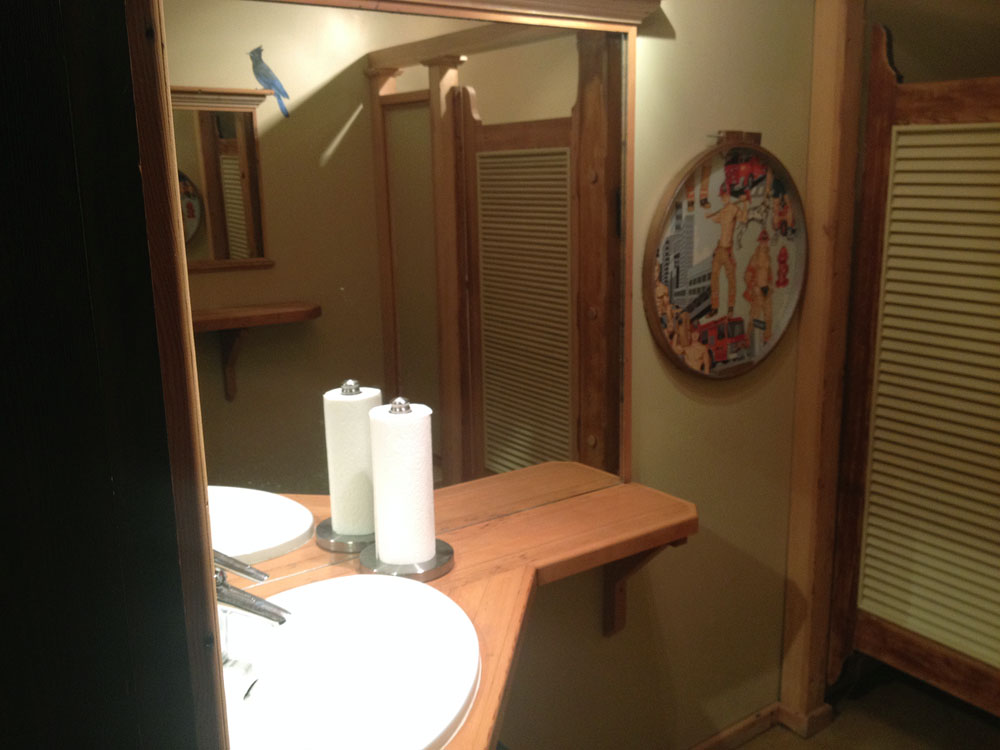 Old Firehall in Rossland women's bathroom uses reclaimed wood