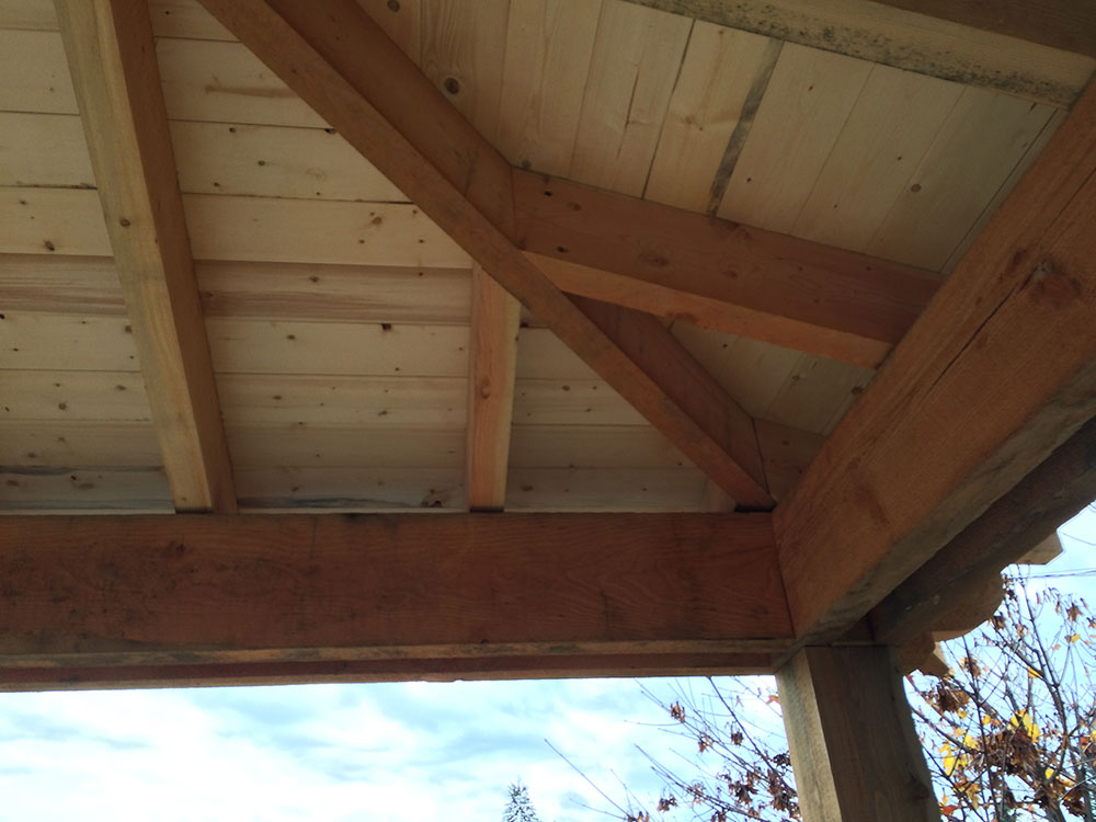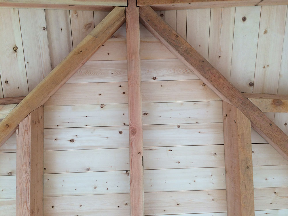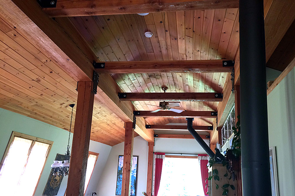 Beam supports and wood ceiliing view from the inside of the house