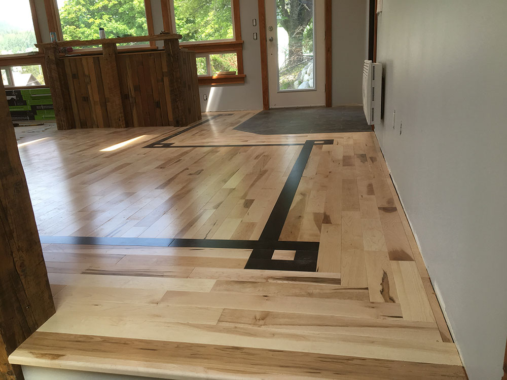 Walnut inlay on Maple wood floor with reclaimed Larch window casings