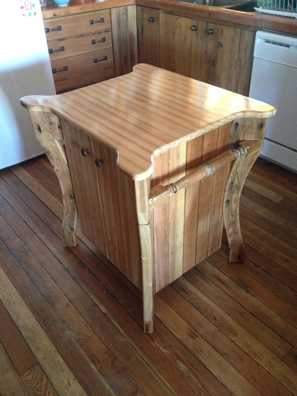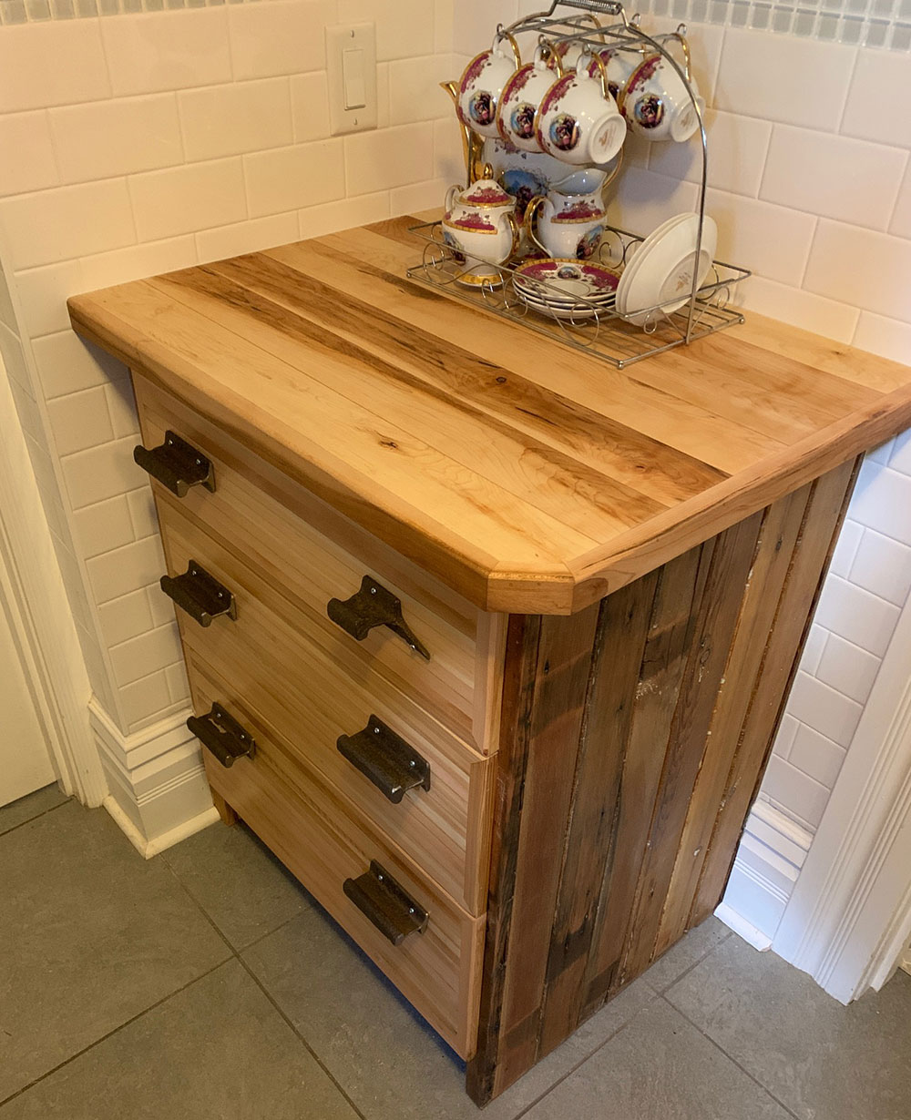 Railway ties used for drawer handleson reclaimed Larch with a Maple top