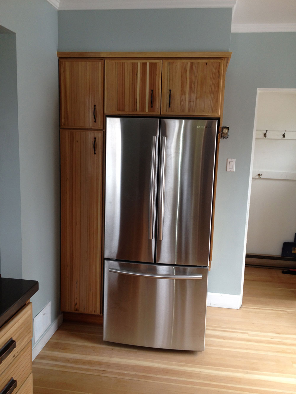 Beautiful reclaimed wood was used on this kitchen for Andrew O'Kain