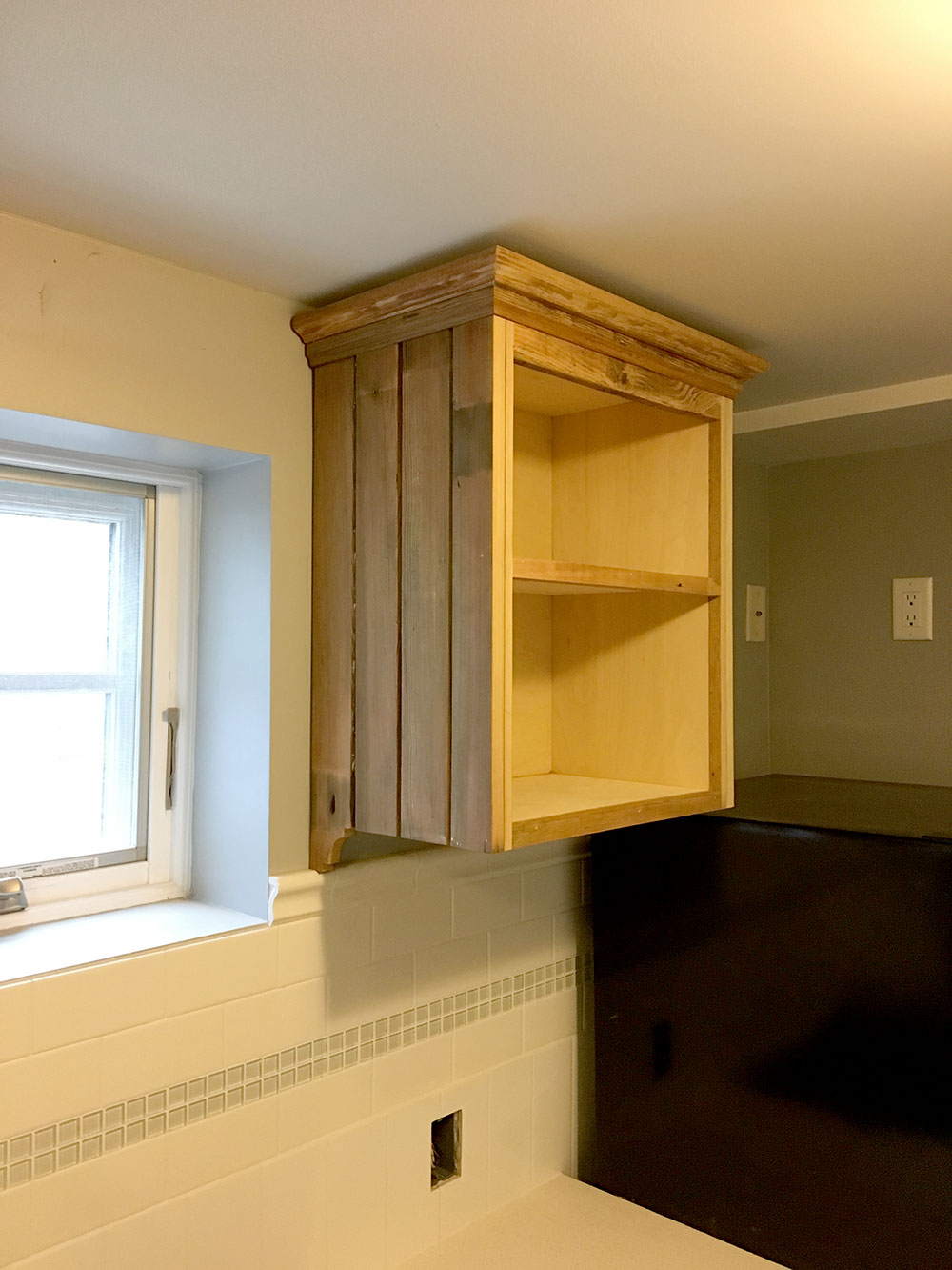 Custom upper kitchen cabinet shelf unit with moulding detail