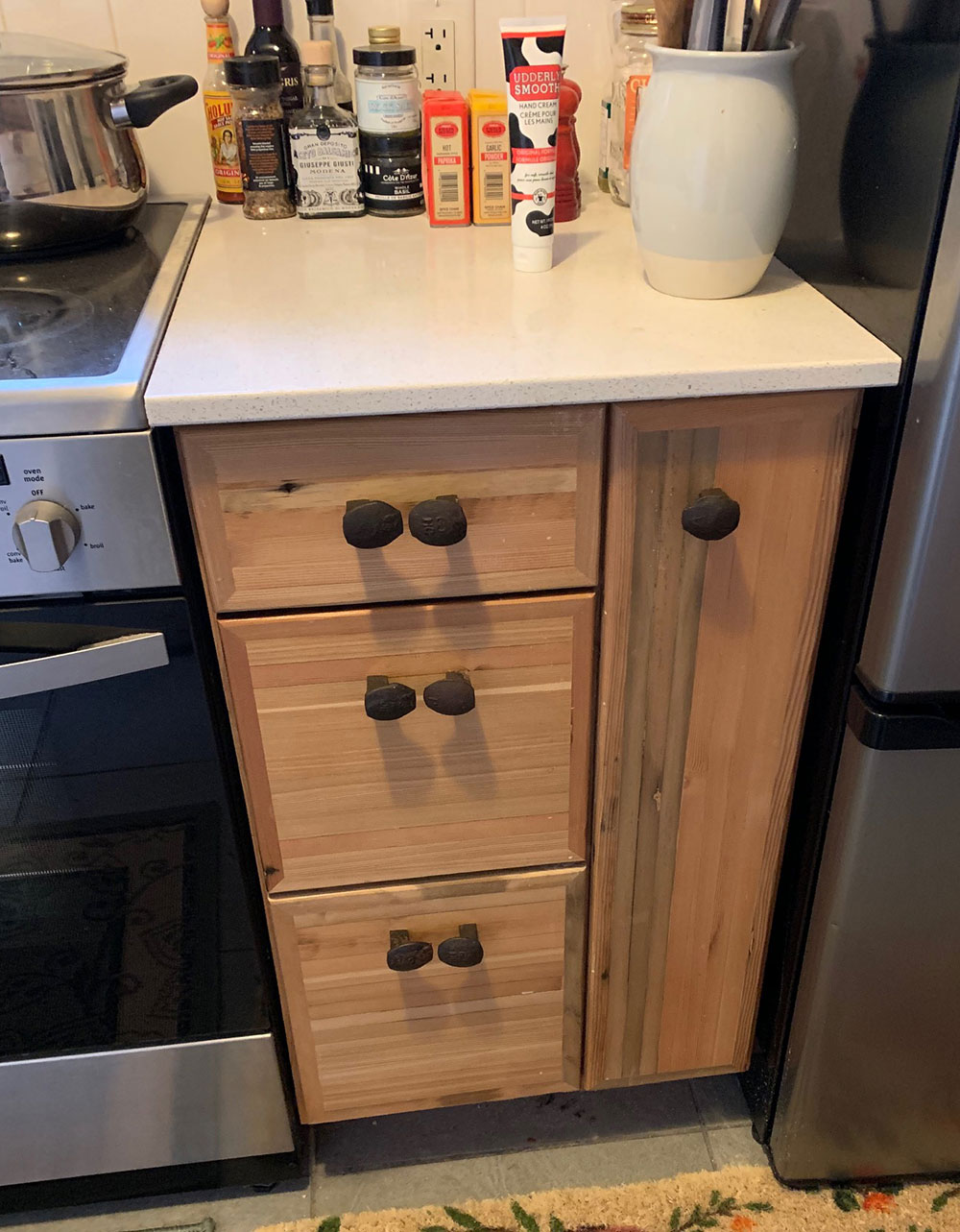 Old railway spikes and ties used as hardware for drawer & cupboard handles